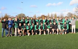 Lymm’s first team squad and senior officials celebrate the King’s Award for Voluntary Service