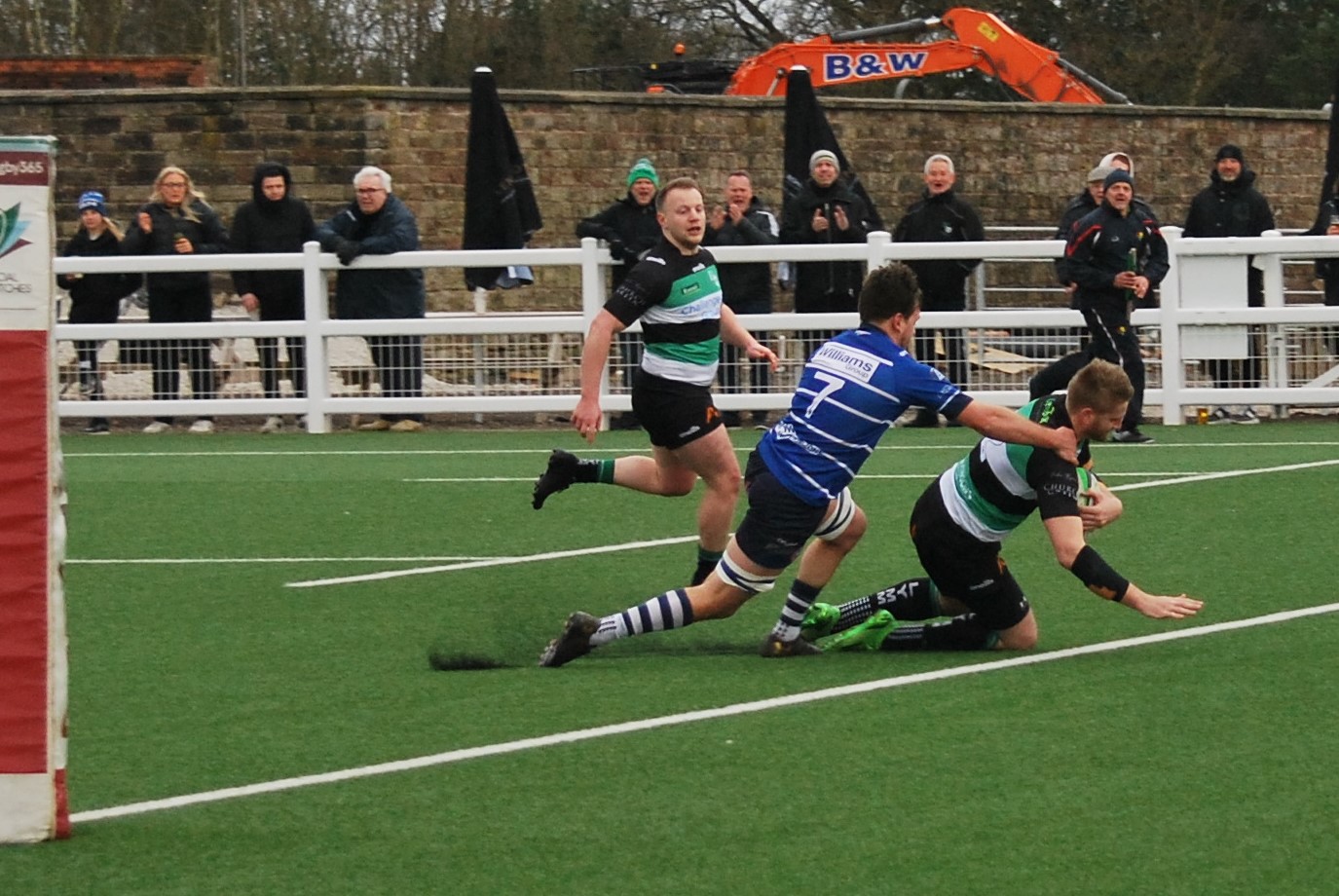 With an 8-point lead, and news of 2nd place Blackburn’s loss at Sandbach, filtering into the crowd, the game looked in hand for the hosts. Macclesfield however, were going nowhere. They continued to pressure Lymm, forcing multiple penalties, some baffling (including one truly inexplicable charge down decision) some very much warranted, and were deservedly rewarded when number 8 James Oliver powered over blind from a 5m scrum after sustained pressure. Lymm 29 Macc 26 with 15 minutes to go. They would reclaim the lead in familiar fashion. Another long, looping pass, caught out the Lymm edge defence and winger Adu finished well in the left corner holding off the attentions of Beesley and Nolan. Lymm 29 Macc 31 with a missed conversion and Lymm in desperate need of some possession with ten remaining.