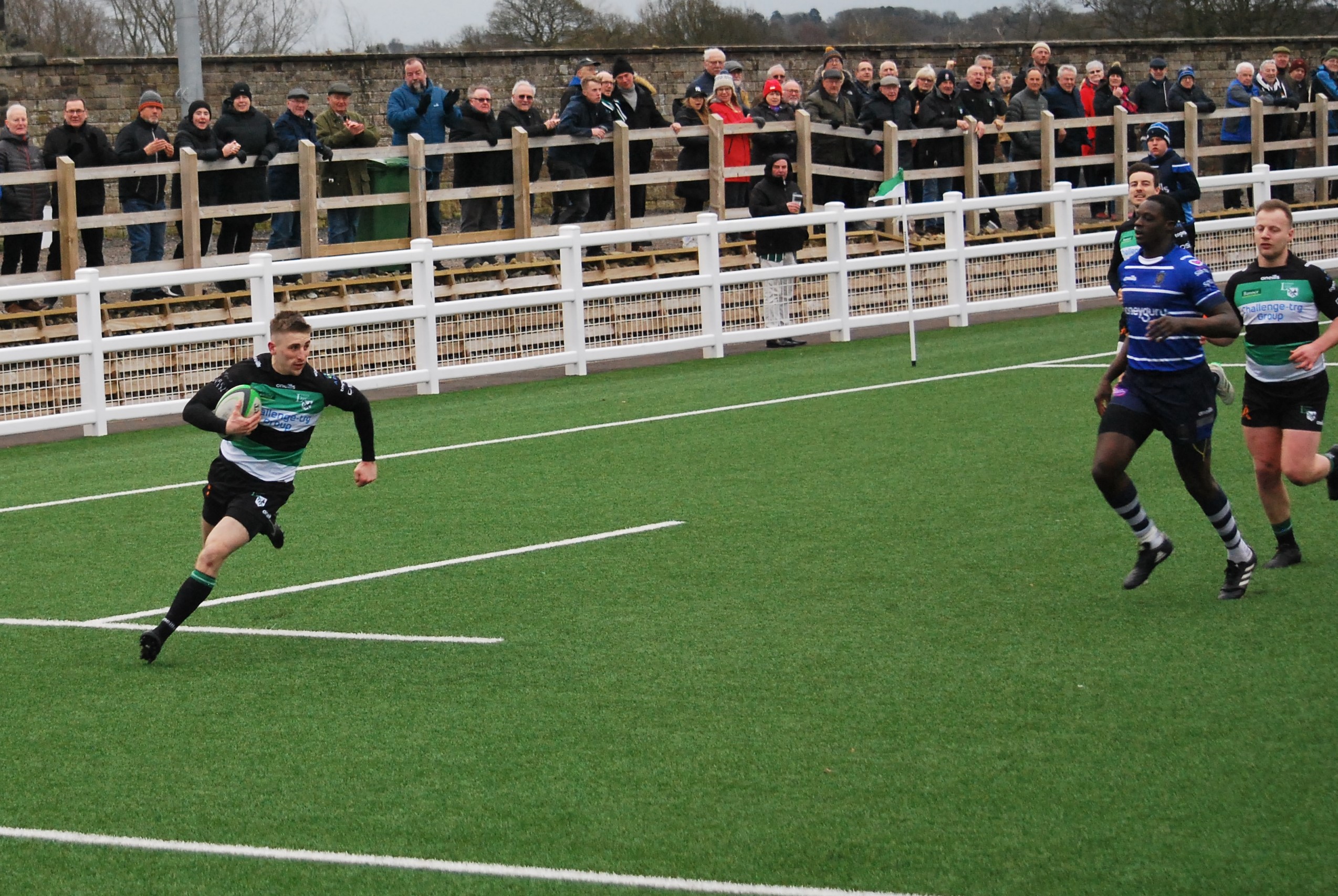 Macc’s response was instant. Miscommunication from the kick-off in the Lymm ranks allowed the ball to land, bounce out and force a tricky lineout from their own 5m. They claimed the lineout but a knock on in the carry by the clearance pod gifted the ball to Macc who gathered, recycled and barged over through their inside centre Barbarinsa whose powerful running was a feature of their game. Lymm 7 Macc 7 after 15 minutes and very much even. Lymm’s response was just as quick as Macclesfield’s. From a lineout on halfway, Harry Martin, who was prominent throughout, punched up in midfield, the ball was recycled back blind through the hands of Woods to Shard. Shard’s delayed pass found Jennings sweeping round and the powerful winger did the rest, blasting home from 50m out whilst seeing off three Macc defenders on his way. Another Lymm score from their dangerous set play arsenal and an outstanding finish from one of the season’s stand-out performers. Lymm 12 Macc 7 with the difficult conversion missed into the wind.