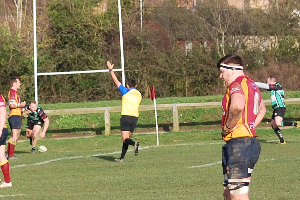 On 17 minutes, Lymm were awarded a penalty 40m out and 15m in from the left touch. Nolan, with the wind virtually directly behind, elected to go for the posts. His radar was spot on as the ball bisected the uprights and had sufficient power to just clear the cross bar. Lymm now had their noses in front. 7-8