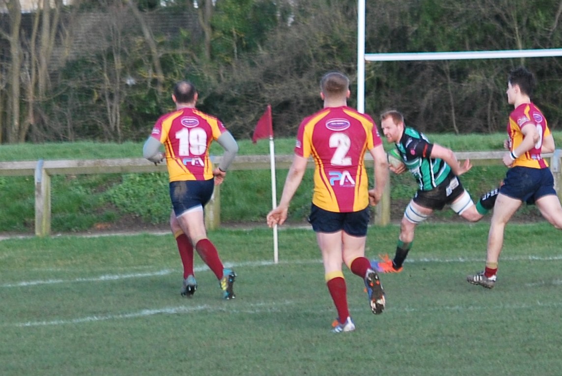 After 23 minutes, Lymm scored their second try. A period of patient possession rugby had probed and tested the Sandal defensive line, which was finally breached by the marauding James Yates, taking play to within 15m of the Sandal line. Once again, the ball was recycled, this time out towards the right flank, after which a switch to the blindside put James Kimber in space, allowing him to tiptoe down the touchline, virtually unopposed, to score. Nolan again failed with the difficult conversion attempt. 7-13