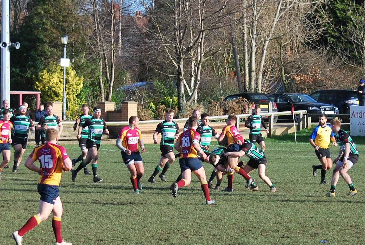 Sandal won the toss and elected to play up the slope and against the wind in the first half. The early exchanges were all Sandal, with Lymm struggling to get any meaningful time on the ball. When Lymm did eventually win a penalty and then secure possession from the resultant line-out, they were penalised at a subsequent break down, a decision which was contested with such ill-advised passion, that the referee marched the penalty mark 20m closer to the Lymm line. This gave Sandal the opportunity to find touch much nearer the Lymm line and then, employing a well-executed driving maul, scoring the first try of the match, about 10m in from the left-hand touchline This required an excellent effort from fly-half Wood to add the extras. 8 minutes gone and Lymm had got off to a far from ideal start. 7-0